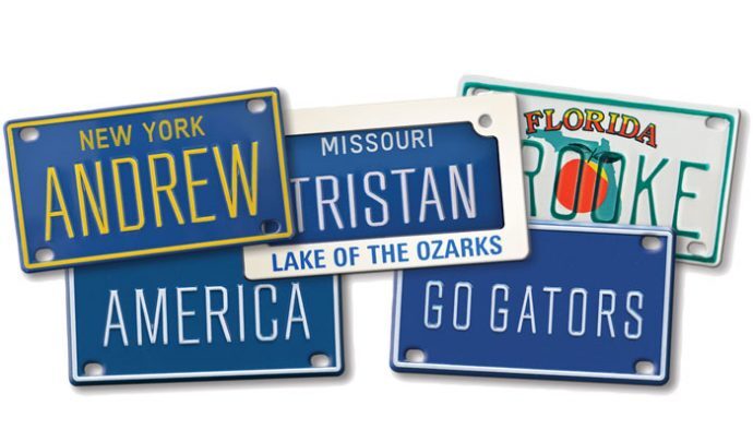 Voorco Design mini personalized license plates have been a very popular family tradition since 1963. The plates are a perfect accessory for a bicycle, scooter, stroller, wagon or golf cart.